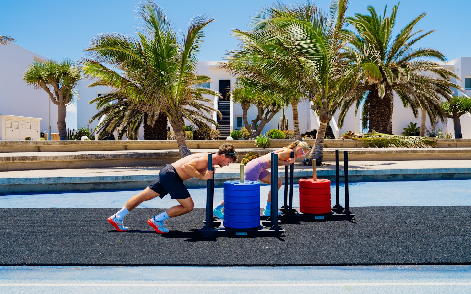 Entrena en el primer gimnasio HYROX al aire libre del mundo de Club La Santa. El gimnasio se encuentra en la Zona Funcional del estadio. Abajo encuentras todo equipamento para cada estación del HYROX workout: