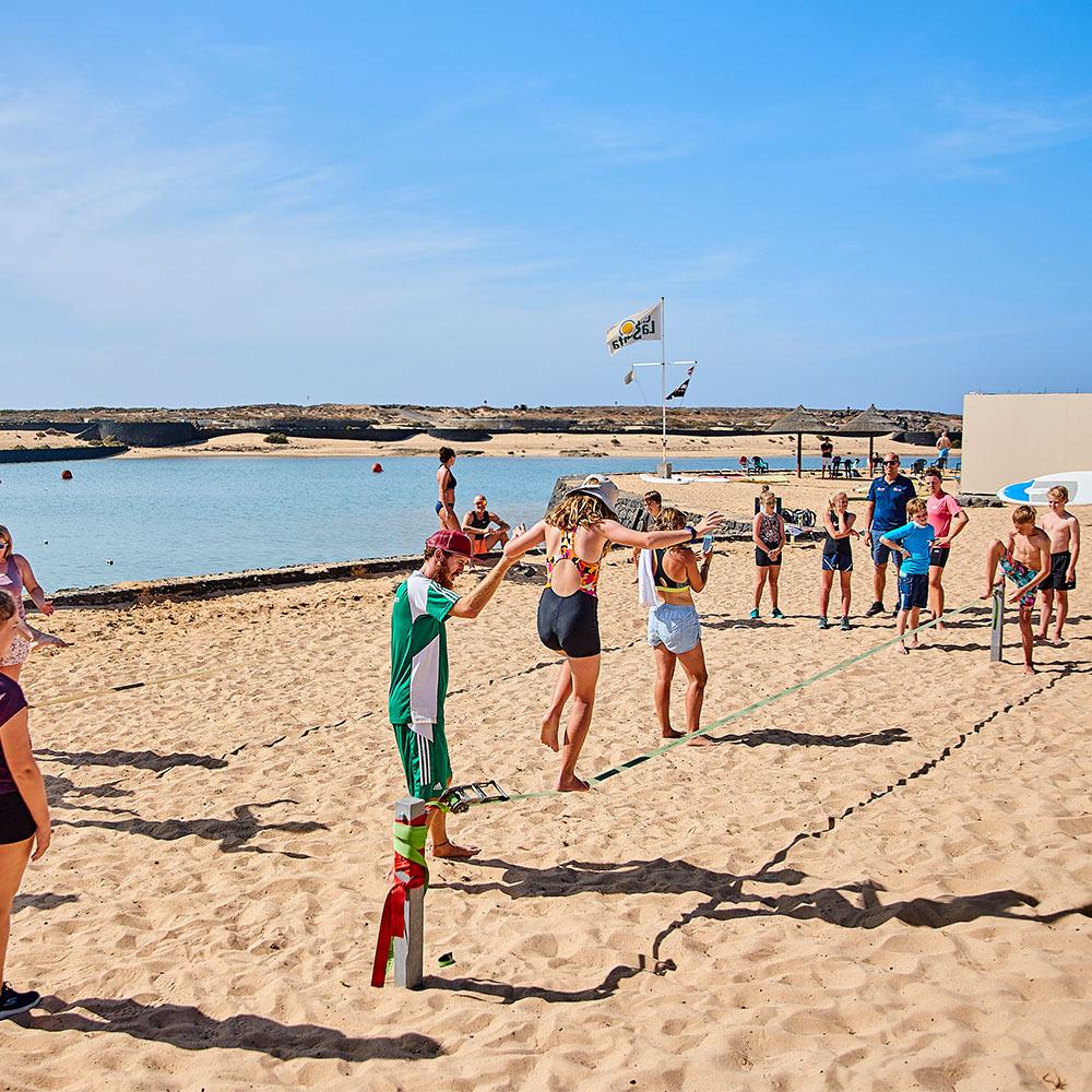 Entrena tu equilibrio con nuestros dos slacklines en la playa, cerca del centro de deportes acuáticos. La mejor y más divertida manera de calentar y practicar el equilibrio antes de una sesión de surf o SUP.